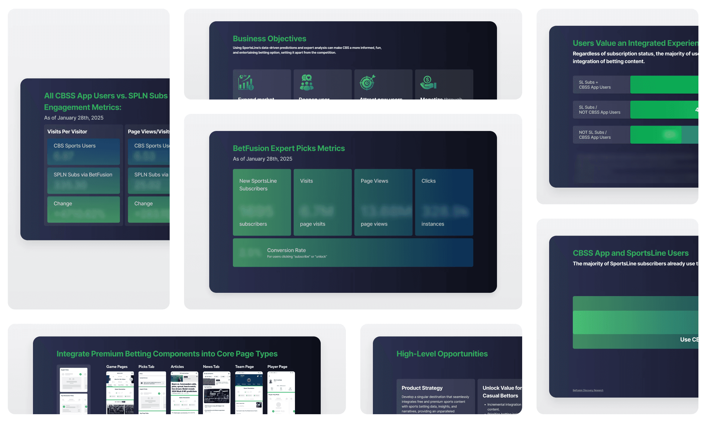 These insights became the foundation for CBS Sports’ 2025, and beyond, betting strategy. Our work was presented to top executives, then distributed across product, marketing, and content teams to guide roadmap planning and identify near-term and long-term opportunities. It helped prioritize features like expert pick integrations, sportsbook integrations, and personalized betting content aimed at easing new users into the space.